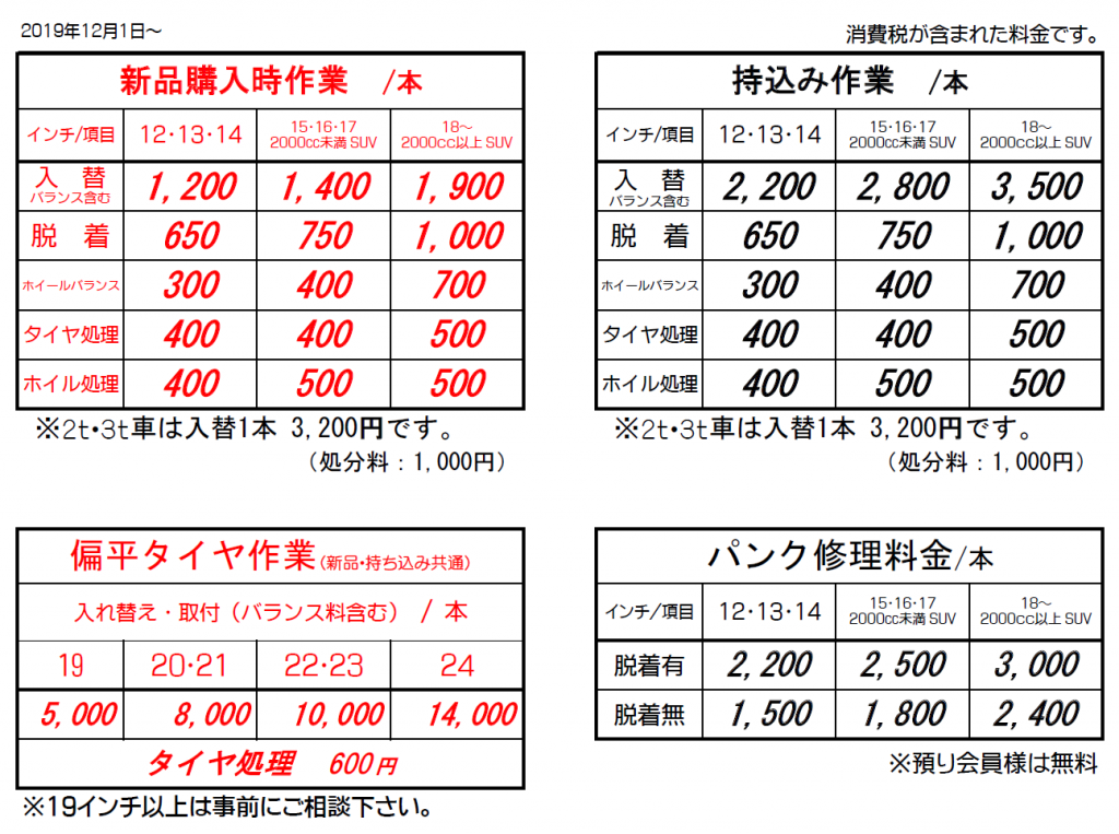 ※安全性を著しく欠くタイヤや、輸入タイヤ、通信販売等で購入されたタイヤなどの作業はお断りする場合がございます。また、そのようなタイヤの作業を行っても、その後の一切の責任を負いかねますのでご了承ください。